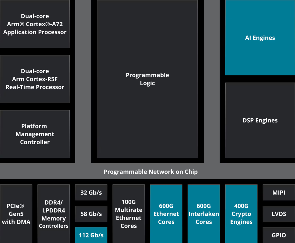 It’s not just traditional FPGA fabric anymore. Modern SoCs have dedicated hard silicon for each component, all interfaced by a programmable network on a chip (NoC) that moves data seamlessly within the device instead of across multiple chips. The processing system, programmable logic, AI engines, and NoC are tightly integrated within a single package.