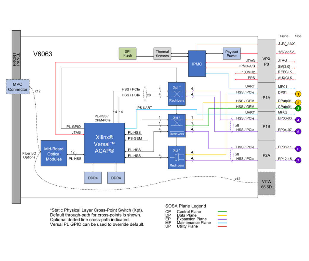 The V6063 serves as a standalone data interface and processing solution in a single 3U VPX module. The V6063 provides twelve (12) full duplex optical ports supporting from 1-25G per lane, FPGA fabric resources, ARM processor cores, and AI/ML hard cores. The V6063 can also be used adjacent to CPUs and/or GPUs in a 3U VPX system. In this arrangement, the adjacent CPUs/GPUs are unburdened of the data interface overhead and can be dedicated to running high value applications and algorithms with the V6063 feeding them data directly across the backplane.
